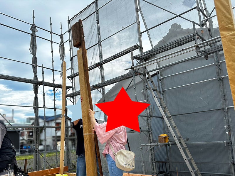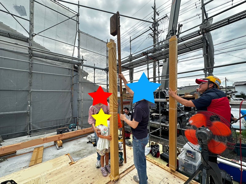 そして作業開始の少し前、お施主様ご一家も現場に来て下さり最初の柱建てをして下さいました!まずはご主人様…