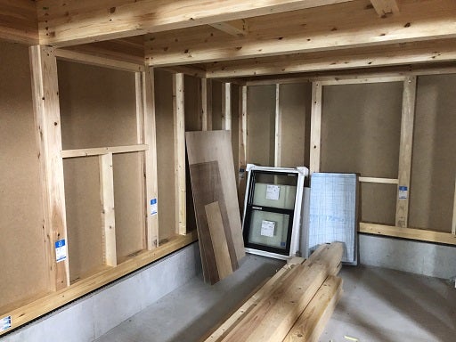 上棟後、棟梁は外部の耐力面材の釘打ちと壁部分の間柱建て及び窓台、まぐさ等のサッシ下地の作成を進めています。