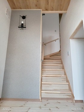玄関を開けるとかわいらしいアクセントになる照明、パイン材の床と階段、木目調クロスの天井が心地よく迎えてくれます。今週末は、いよいよお引渡しですね!