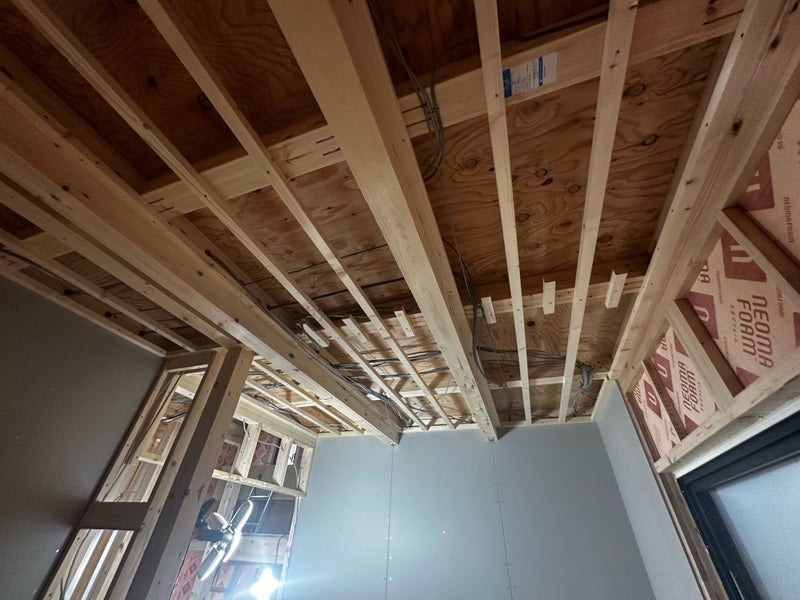 断熱材監査の後は天井の下地組み、天井ボード貼りを行っています。石膏ボードはビスの間隔が決まっているので間隔が広くならないように気をつけて施工しています。