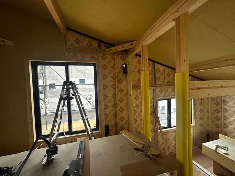 階段取り付け後は2階の壁のボード貼りを行なっています。ビスの打ち込み深さや間隔を気をつけながら作業しています。ボードが全て貼り終えた段階でボードの監査を実施します。しっかりとチェックを行うので安心してください!