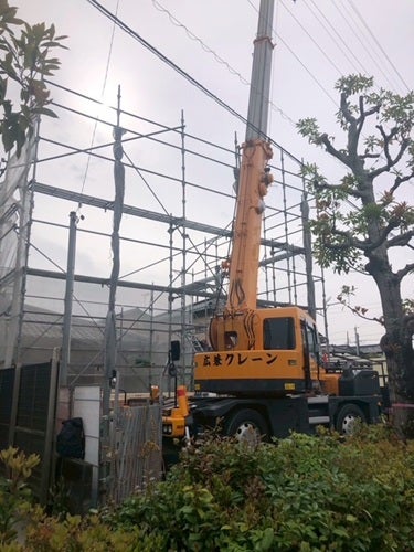 早朝からクレーン車が天高く伸びます。