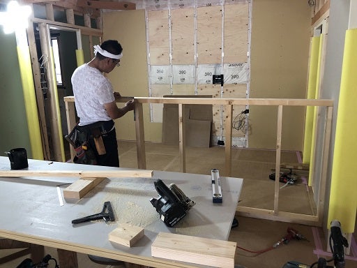 内部も外部も工事は順調に進んでいます。内部では棟梁がキッチン前カウンターの壁下地を組みました。