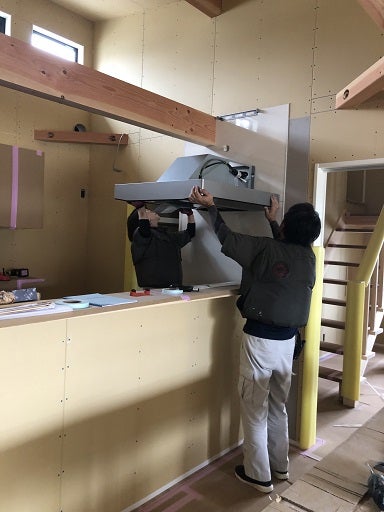 まずはキッチンパネルの取付から進め換気扇の取付をおこないます。