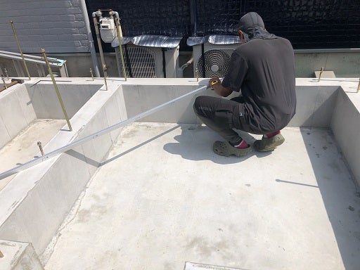 基準墨を出しそこから直角を出してスパンの確認をし全ての通りに墨をだしていきます。