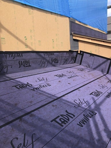 野地板、下地のボードの施工まで完了しルーフィングの施工まで完了です。重ね合わせ長さや壁取り合い部の立ち上がり高さもバッチリです。