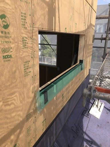 窓を収める準備として防水部材の取付を進めています。