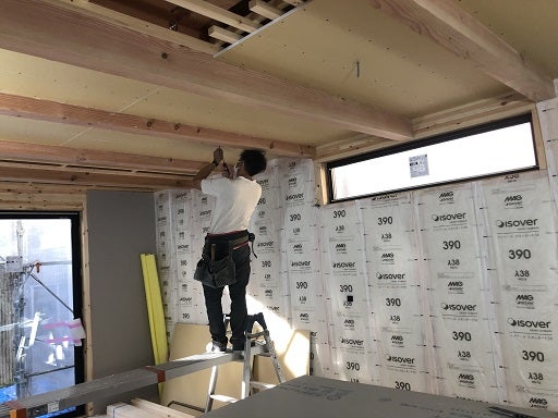 内部も外部も工事は順調に進んでいます。内部では棟梁が1階部分の天井ボードを張り終わり