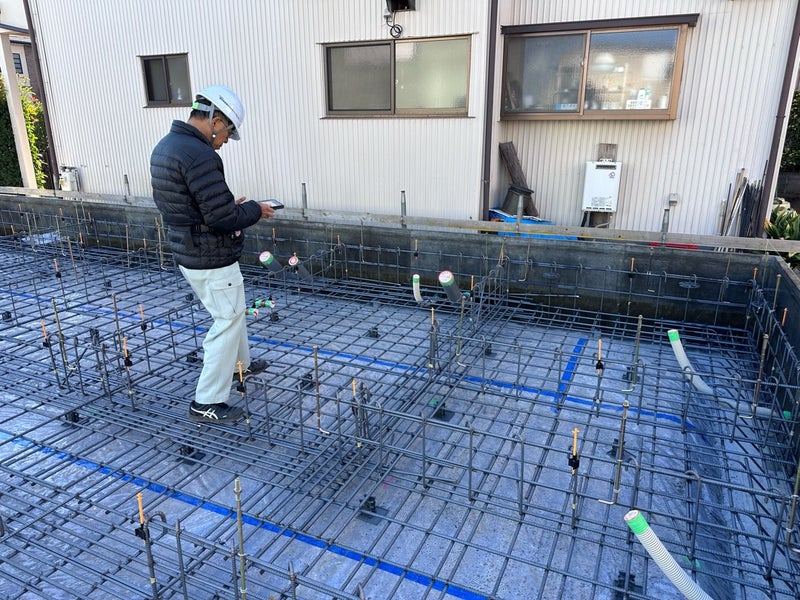 鉄筋組みが終わったら配筋検査です。まちづくりセンターの検査員による検査と社内検査で二重にチェックしています。検査は何事も無くクリアとなりました!