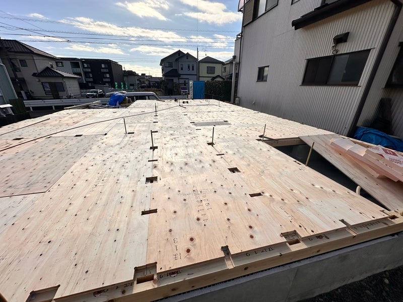 床合板を敷いて釘で固定、最後に汚れ防止のシートとブルーシートで養生をして土台伏せ完了です。この後は上棟用の材料搬入、足場設置をして上棟となります。上棟日までもう少しです。I様楽しみにしていてくださいね!