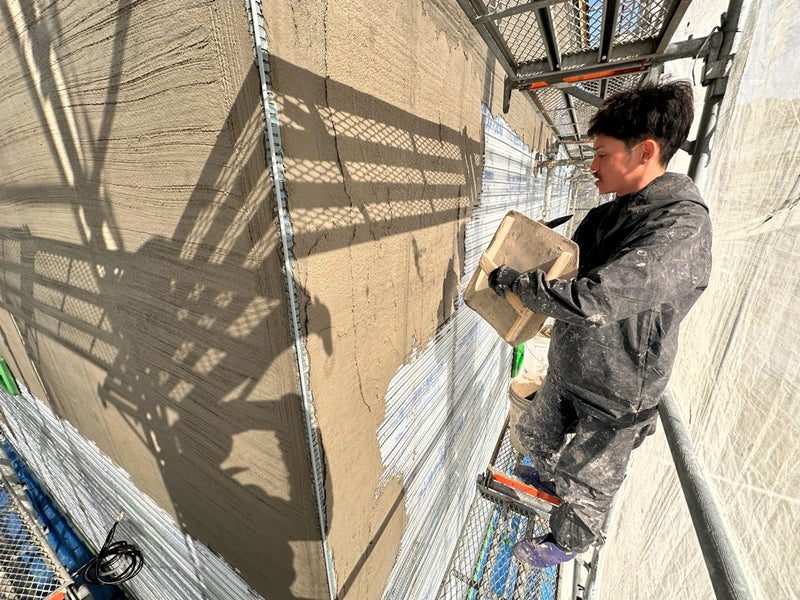 今週は中塗りまで施工し、モルタルが固まるまで約10日間の養生を行います。