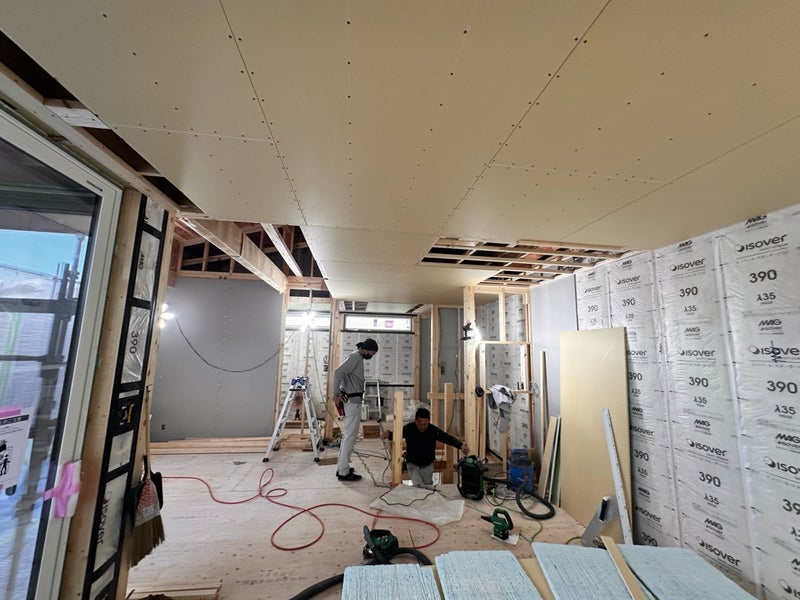 内部は天井ボードを貼っています。この後は床材を施工して壁のボード貼りへと進んでいきます。