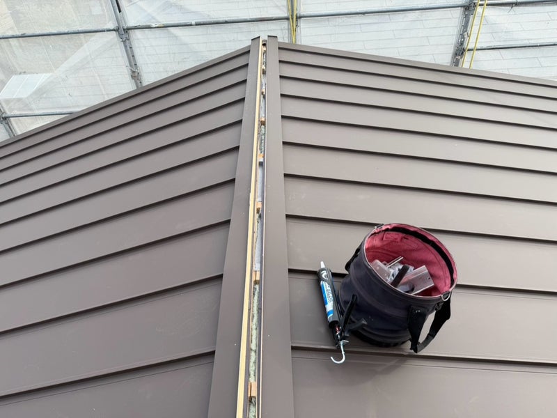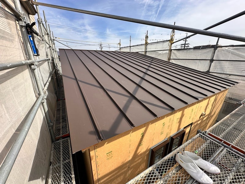屋根板金の施工を行いました。工場で加工された屋根材を職人さんが一枚ずつ貼っていきます。