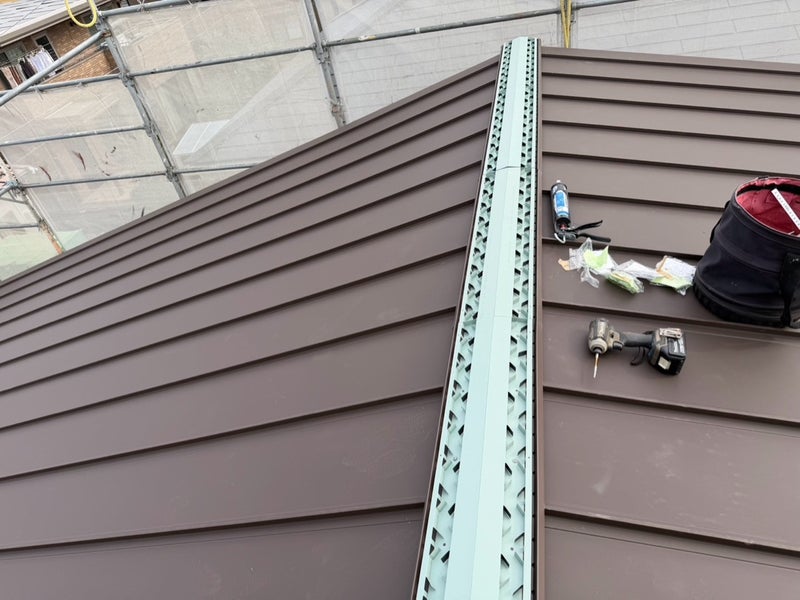 切妻屋根なので棟の部分に棟換気材を取り付けて屋根内の通気がしっかりと取れるようにしています。