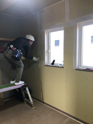 まずはプラスターボードのジョイント部分やビス頭を平らに仕上げていくパテ処理からです。