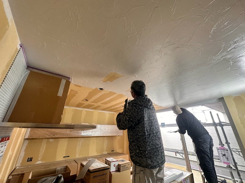 使用していのはダイアトーマスという自然素材を使った塗り材です。コテ模様もいい感じに出ています。来週から壁の方も塗り始めます。仕上がりが楽しみですね!
