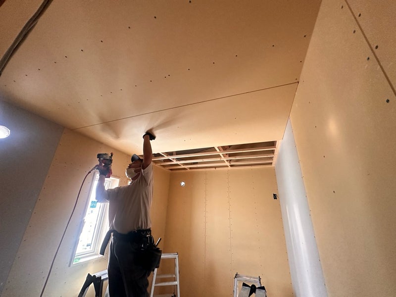 2階の方から天井のボード施工を進めています。ビスの間隔などに注意しながら一枚ずつ丁寧に施工しています。
