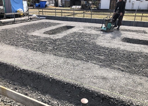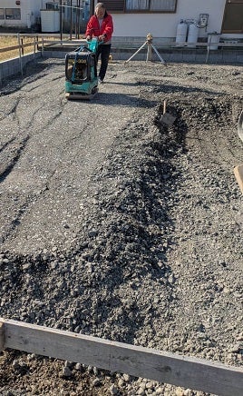 遣り方後、掘削根切工事を進めました。遣り方の貫に糸を張り床(トコ)を出来るだけ乱さないように掘削深さを確認しながら進めていきます。根切底は十分転圧していきます。その後砕石事業に取り掛かりました。
