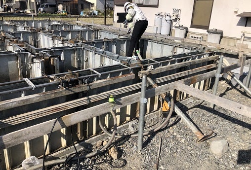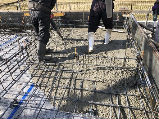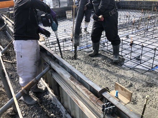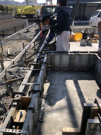 検査終了後、早速立ち上がり部分のコンクリートを打設しました。こちらも生コン車が到着し伝票にて強度を確認し打設開始です。