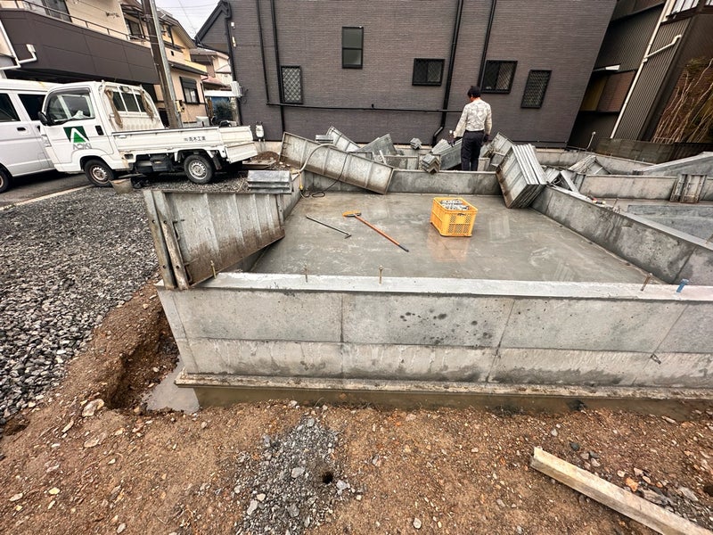 生コン打設から養生期間を経て型枠撤去、ポーチの荒打ち施工を行い、基礎工事が無事に完了しました。玄関部には底盤と立ち上がりにしっかりと断熱材を入れています。