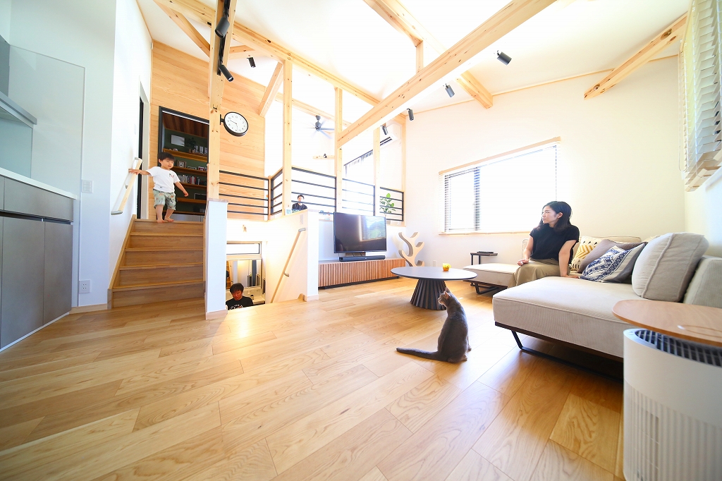 無垢の家の夢ハウスは吹き抜けの大空間が気持ちいい木のぬくもりを感じる家。木の香りと素足に感じる木の感触が癒しをくれる本物の健康住宅としても人気です。
