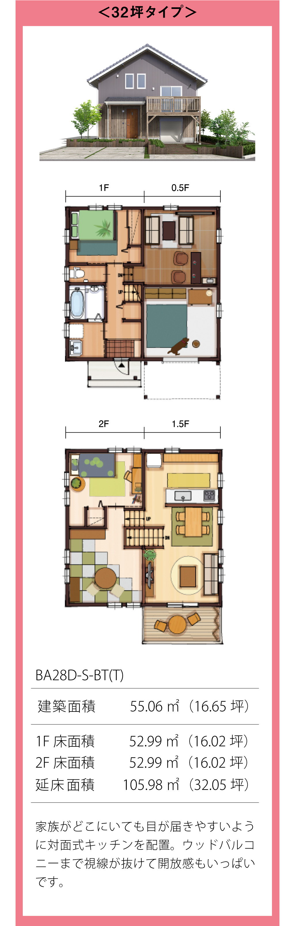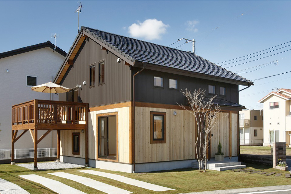 シンプルで落ち着きのあるデザインのファサードです。1.5階のウッドバルコニーは、開放的な展望台。家族をさりげなく外へと連れ出してくれる設計です。
