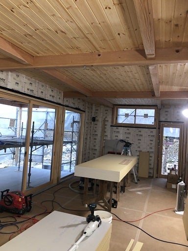 内部も外部も工事は順調に進んでいます。内部では、天井の無垢板貼りが終了しました。