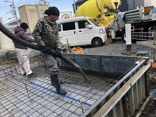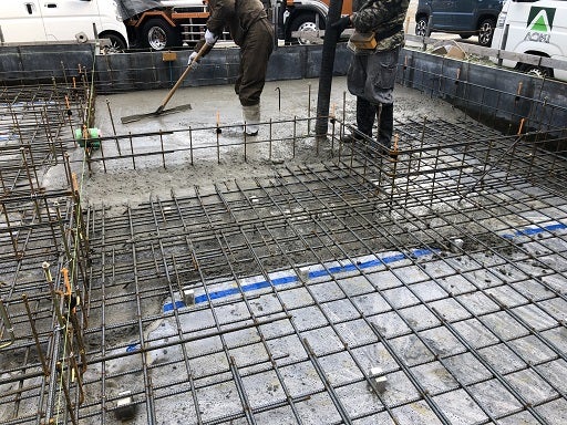 基礎工事は順調に進んでいます。配筋検査合格後、底盤部分のコンクリートの打設工事を行いました。