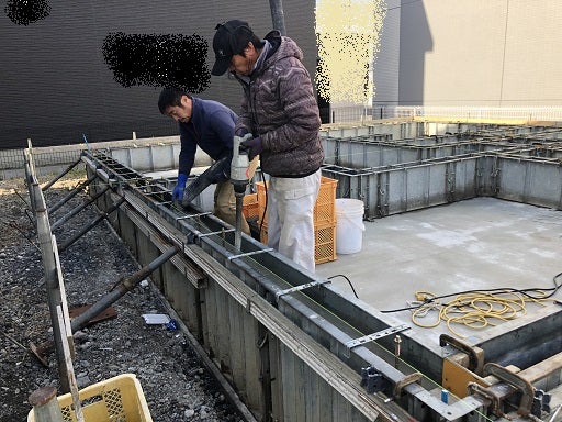 生コン車が現場に到着し、伝票にてコンクリートの強度を確認し、打設開始です!振動機を使い隙間の無いように打設します。