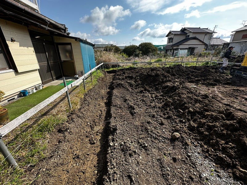 設計GLに合わせて地面を掘っていきます。配置確認の時に設置した遣り方板を基準にして高さ確認をしています。今日明日でこの作業を行い、その後は砕石を入れていく予定です。 基礎完成まで約1か月、楽しみにしていてください!