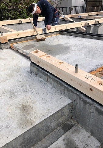 基礎工事完了後、棟梁がはじめて現場に入り土台を据える工事を進めました。