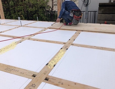S様、ご安心ください。そして床の構造用合板を指定の釘の太さと長さ及び指定の間隔にて施工し、土台据え作業は終了です。