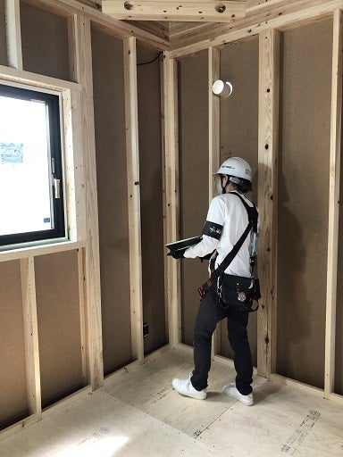 内部も外部も工事は順調に進んでいます。外部の耐力面材、梁や柱の接合金物の取付等の主要構造部分の施工が完了したので、早速社内の構造躯体検査を実施しました。耐力面材の種類及び位置、釘の長さ太さ間隔の確認、土台と柱の緊結、柱と梁の緊結、梁と束の緊結状況の確認、火打ち梁の接合の確認、床合板の厚さ、釘の間隔等の確認をし
