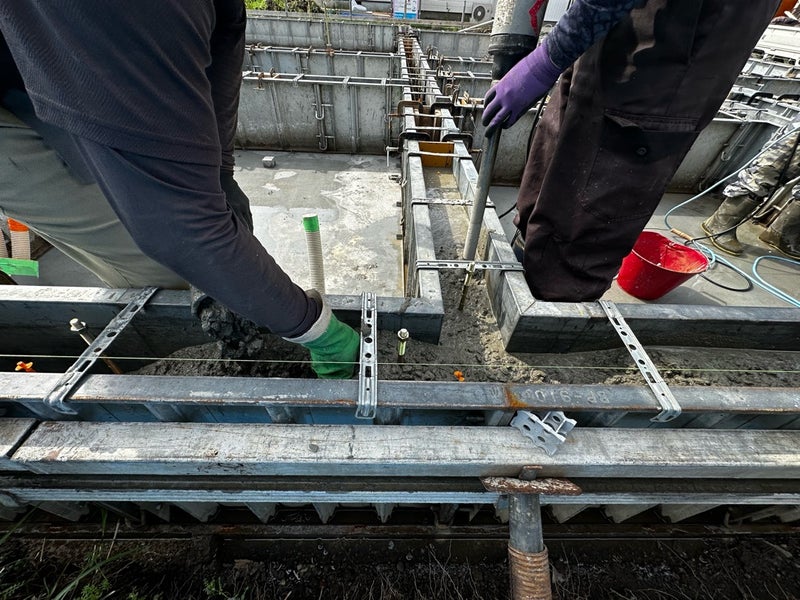 基礎のスラブ部分と立上り部分で2回に分けて打設しています。打ち継ぎ部には止水剤を施工して水の浸入対策をしています。