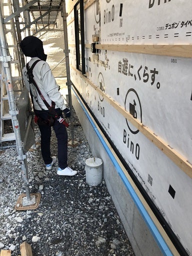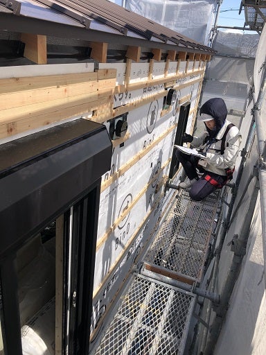 内部も外部も工事は順調に進んでいます。外部では、透湿防水紙の施工及び外壁下地である通気胴縁の施工が完了したので、早速社内の外装下地検査を実施しました。