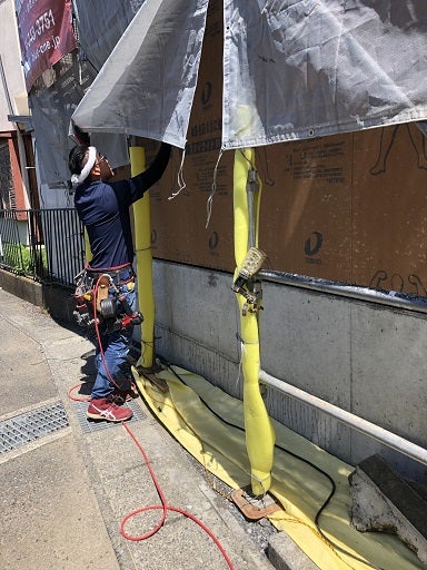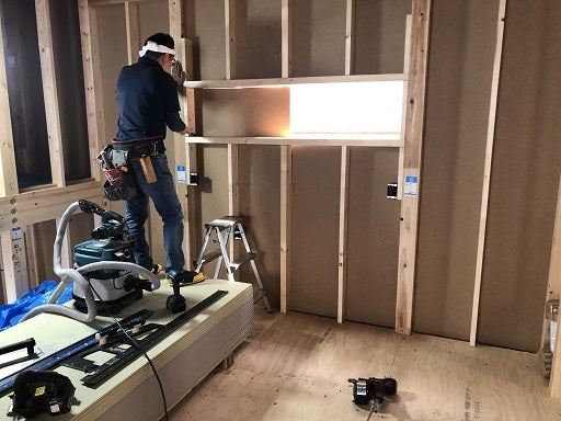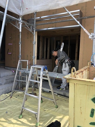 棟梁は窓台、まぐさ等の下地及び壁下地として間柱の施工を進め、外部の耐力面材の施工を進めています。