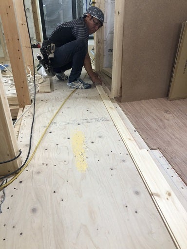 床板を貼る前に今一度、床下地である構造用合板の釘の確認と増し打ちを行い一枚一枚施工します。床板を貼るとすぐに傷や汚れ防止のために養生をしてしまうので一面に広がる床板を見ることができるのは完成時になります。H様、楽しみにお待ちください。