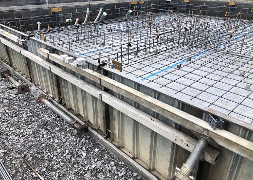 基礎工事は順調に進んでいます。捨コンクリート打設後、外周部の型枠を組み、鉄筋組み工事に取り掛かりました。