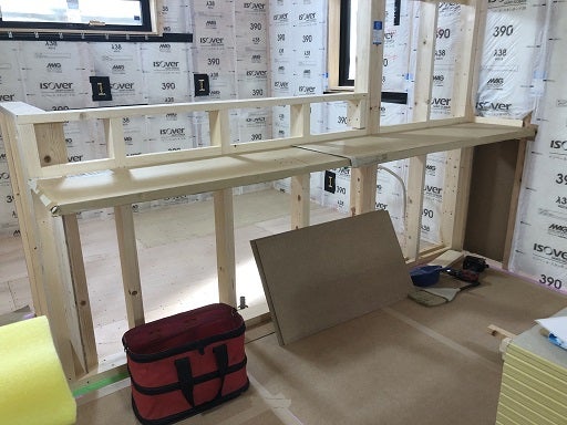 ダイニングのカウンターの作成や各くり抜き壁収納の作成も完了しています。並行して壁のプラスターボード貼りを進めています。