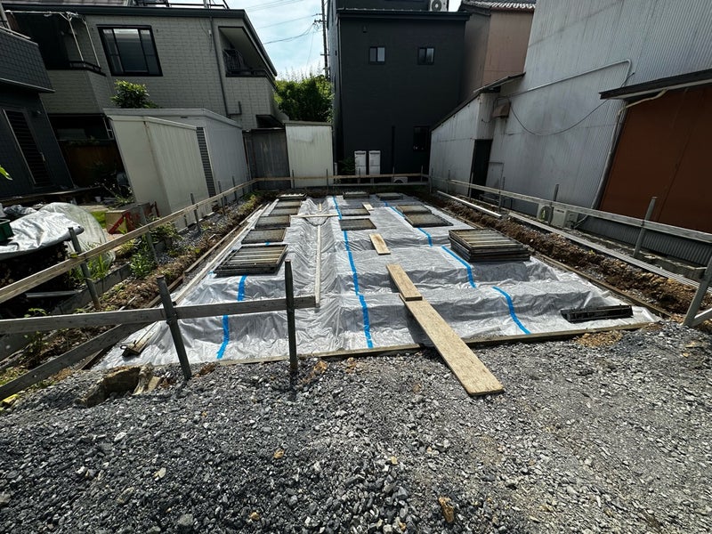 堀方工事の後、砕石を敷いてしっかりと転圧しました。地面から湿気が上がらないように防湿シートを全体にかけていきます。防湿シートをかける前に白蟻対策として防蟻処理を行っています。防蟻処理は上棟後にあと2回実施します。