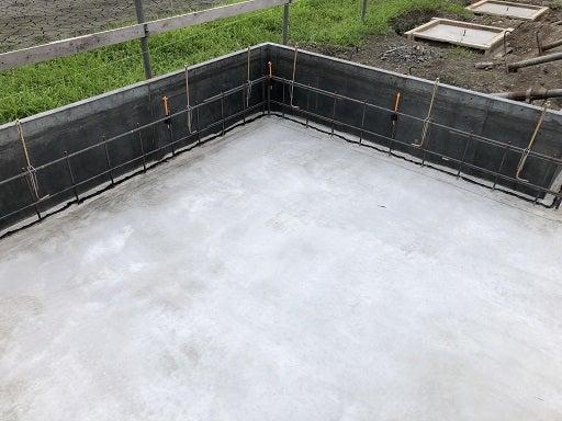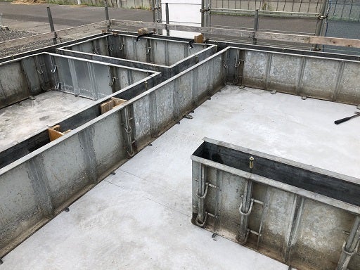 底盤部分のコンクリート打設後、内部の布基礎部分に墨を出し、型枠を組んでいく工事を進めました。
