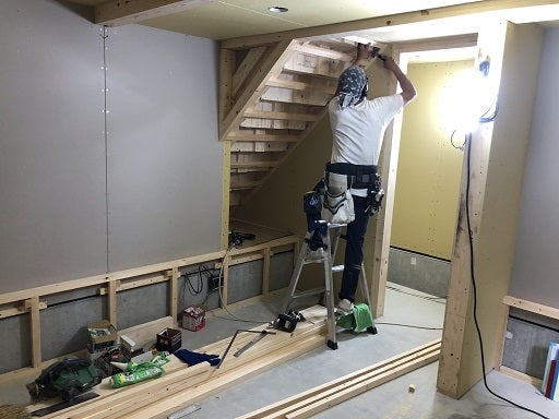 階段下の壁及び天井の下地組みからボードを貼り、