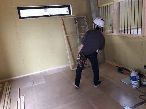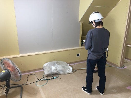 この後、内装工事としてクロス貼り工事を進めていきます。まずは、天井や壁の下地処理を進めていく予定です。次回お打ち合わせ時には、ある程度壁紙が貼れている予定です。