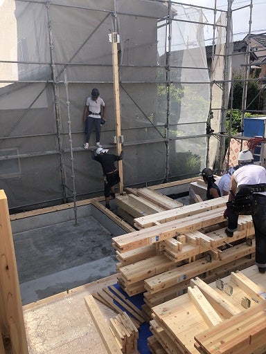 1階の柱から建てていきます。