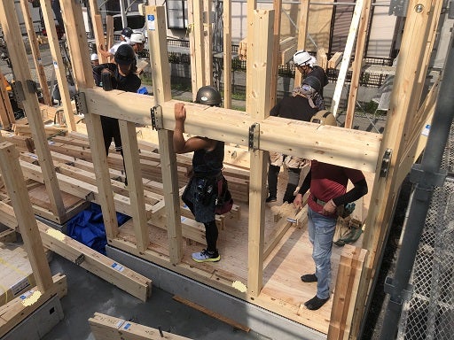 柱と土台の接合部をピンにて緊結していきます。柱が建て終わると次に2階の床梁を組んでいきます。