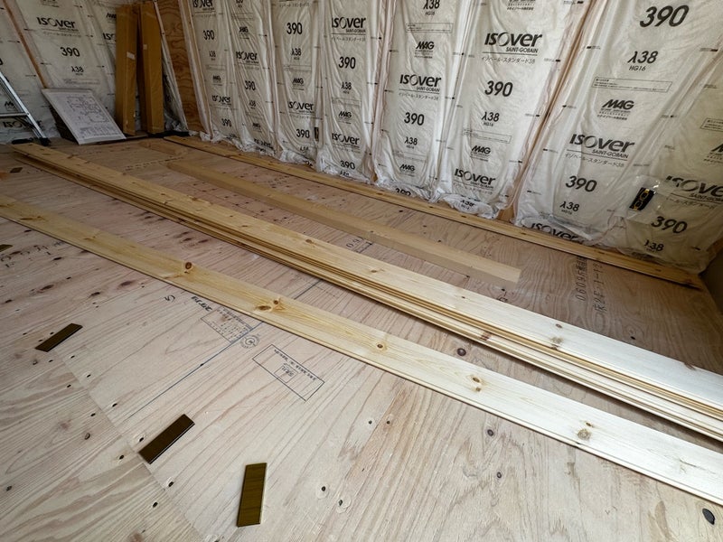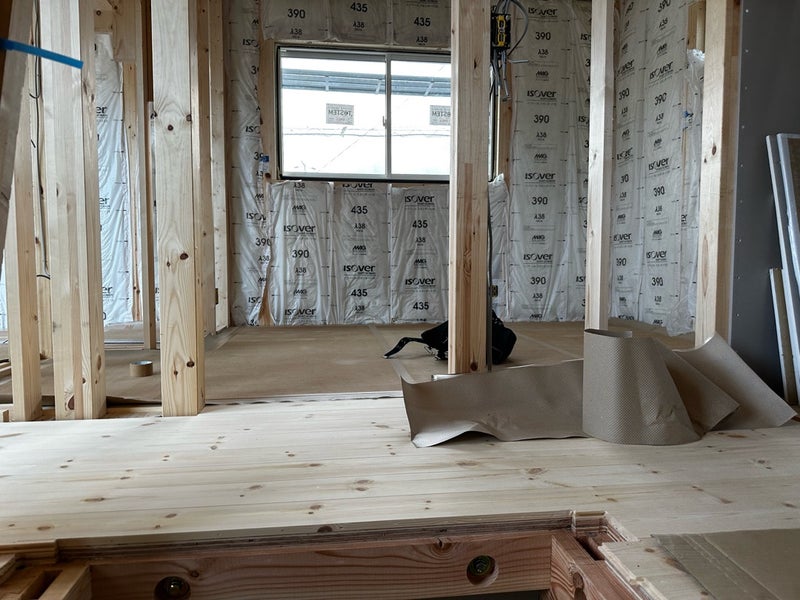 こんにちは!鎌田です。清水区のK様邸です。床のパインフローリングの施工を進めています。