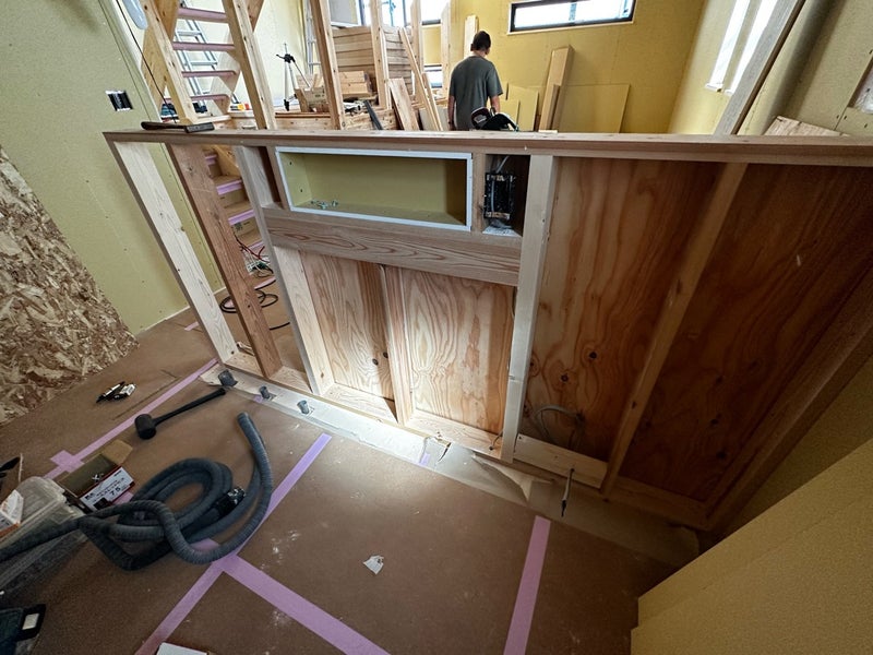 内部の木工事が順調に進んでいます。2階の壁ボード貼りがほぼ完了し、ニッチなどの造作工事を進めています。今週末にスキップ部分のスチール手摺の取り付けが完了する予定です。