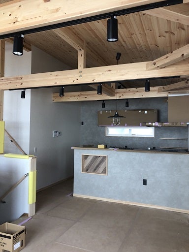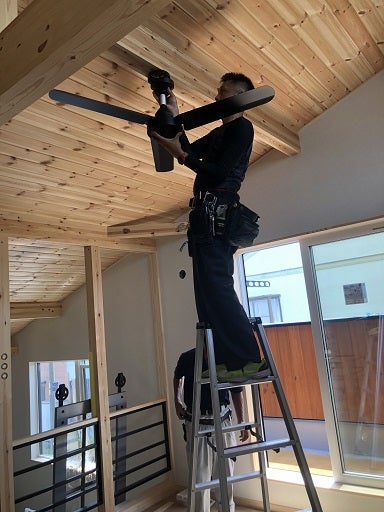 仕上げ工事は順調に進んでいます。壁・天井のクロス貼り工事が終了し、照明器具やシーリングファンといった設備の取付工事や