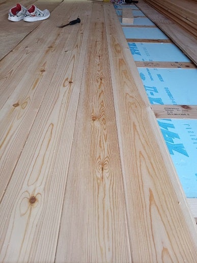 エンブルタウン18号地では、天然無垢材床板の施工中です。