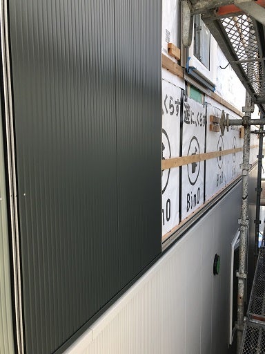 外部は1階のアイボリーの外壁貼りが終わり、2階のモスグリーンの外壁貼りを進めています。